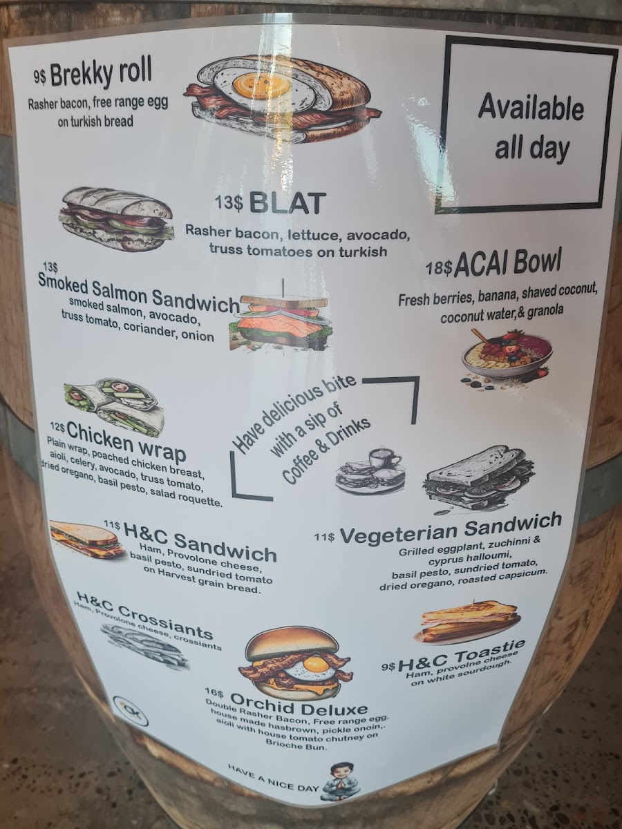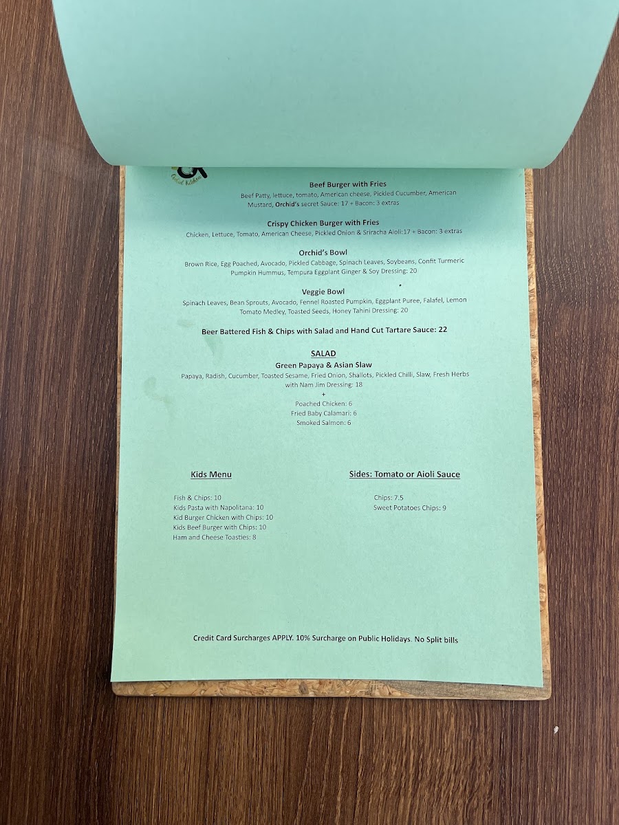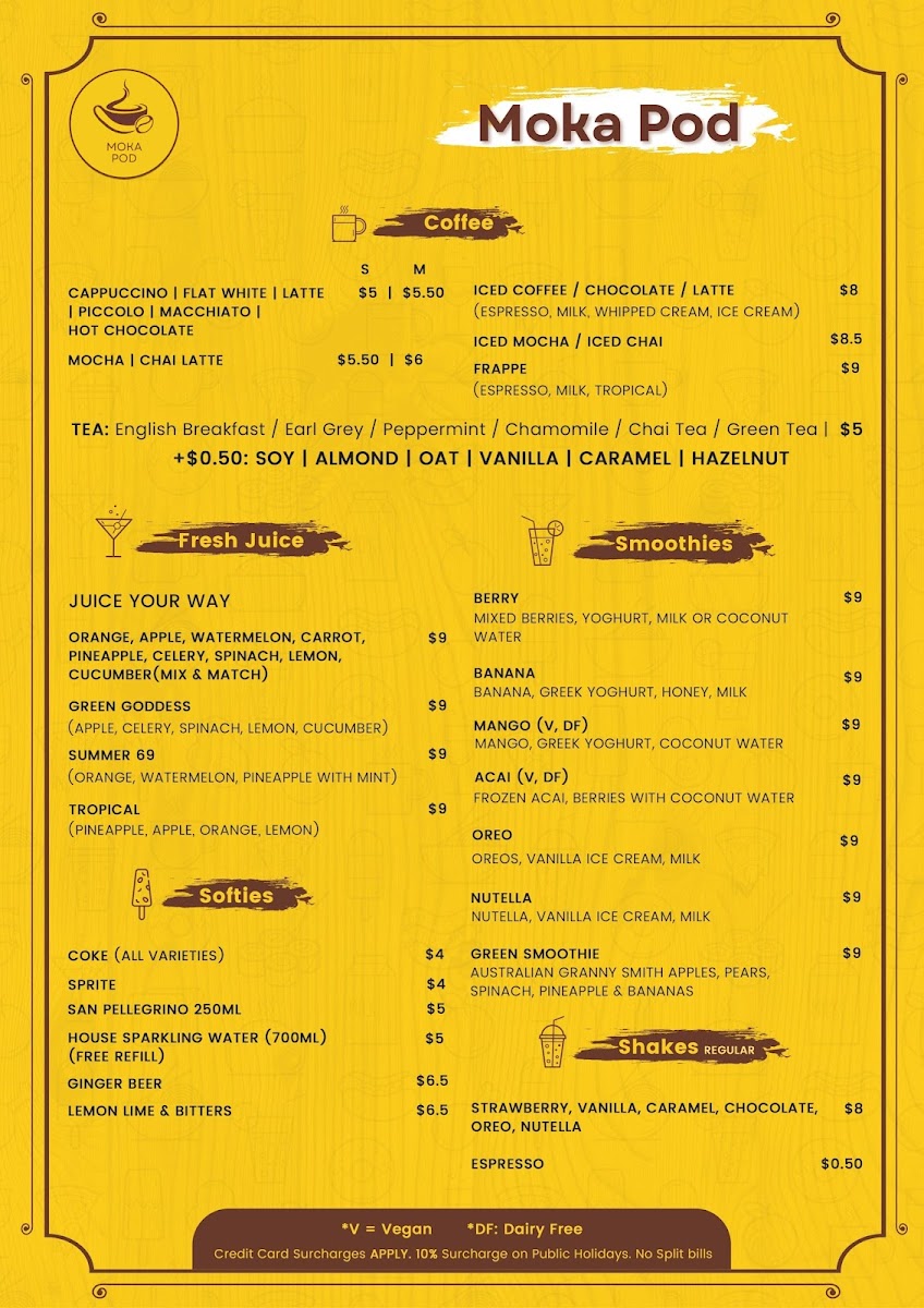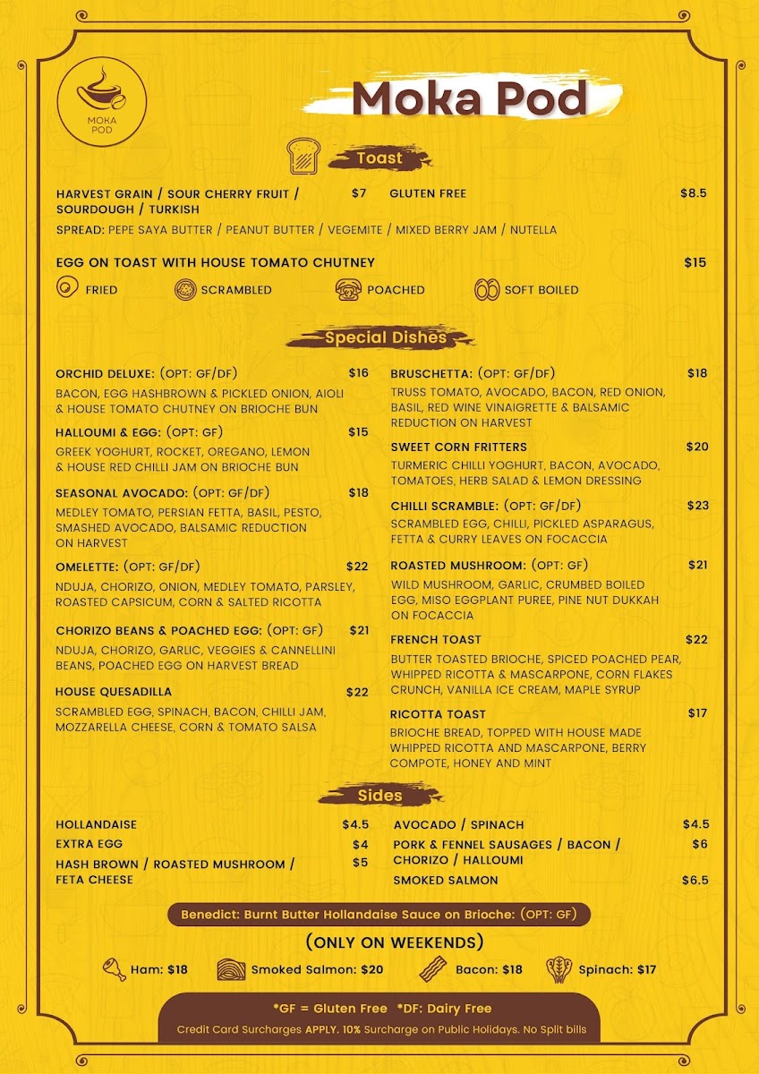 Moka Pod Marrickville offers a diverse and appealing menu that caters to a variety of tastes. For brunch or lunch, you can indulge in hearty options like the Beef Burger with Fries or the Crispy Chicken Burger with Fries, both of which are satisfying and flavorful. For something lighter, the Orchid’s Bowl and Farmer's Bowl offer healthy, balanced meals. Those in the mood for classic comfort food will appreciate the Beer Battered Fish & Chips with Salad and Hand Cut Tartare Sauce. The Kids Menu includes simple favorites such as Fish & Chips, Kid's Pasta with Napolitana, and both Kid's Burger Chicken with Chips and Kid's Burger Beef with Chips, perfect for younger diners. On the side, guests can enjoy crispy Chips, Sweet Potato Chips, or a variety of extras like Hollandaise, Extra Egg, Hash Brown, Roasted Mushroom, or Feta Cheese. For breakfast lovers, options like Toast, a Plain Croissant, and Gluten Free Banana Bread provide a range of choices, while the Fruit Toast with Fresh Ricotta & Local Honey offers a sweet treat. Finally, the Bacon & Egg Roll remains a classic choice for those craving a satisfying morning meal. Whether you're stopping by for a quick lunch, a family meal, or a breakfast treat, Moka Pod Marrickville’s menu has something for everyone.